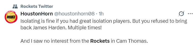 休媒:如果火箭有很多防守出色的球员那么采取这样的战术无可厚非,但如今火箭防守端也并没有太出色。你们还执意拒绝哈登回归甚至不止一次,而且火箭队还对进攻球员卡姆-托马斯不感兴趣。