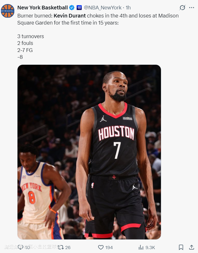 尼克斯媒体:KD在关键时刻掉链子,他在末节发挥失常,这是他在15年来首次在麦迪逊广场花园球馆输球。