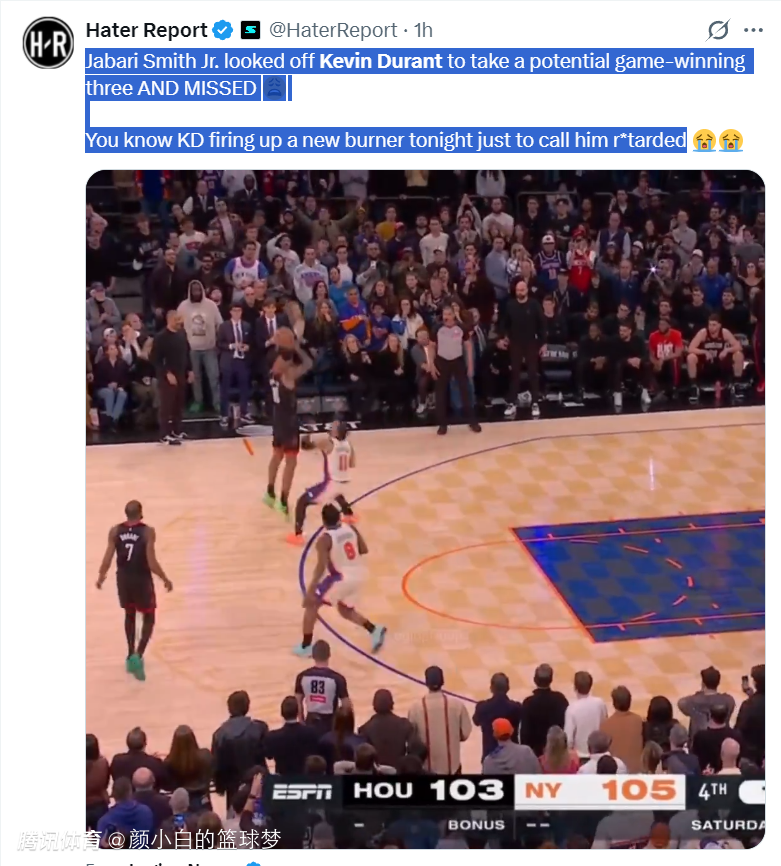 如果没有看比赛,大家会认为小贾巴里-史密斯、凯文-杜兰特两人在关键时刻一人投丢了一个关键球,但看了比赛的球迷就知道杜兰特决胜时刻的表现堪称战犯。