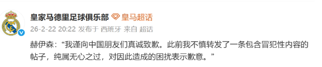 2026-02-22 20:40北京时间2月22日,此前,有球迷发现,皇马后卫赫伊森的ins账号转发了一条多图动态,该动态的首张图片有明显的辱华意味。今日,皇马中文官方微博发布了赫伊森的道歉内容。