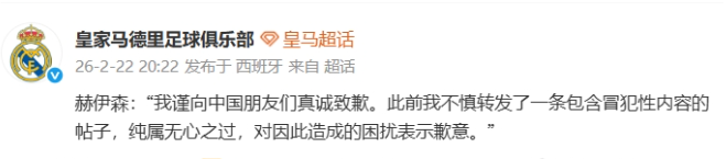 在这条仅发布于皇马中文官博的声明中,赫伊森表示:“我谨向中国朋友们真诚致歉。此前我不慎转发了一条包含冒犯性内容的帖子,纯属无心之过,对因此造成的困扰表示歉意。”