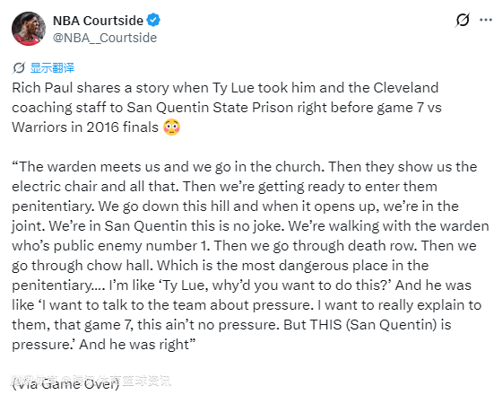 2026-02-22 22:10北京时间2月22日,知名经纪人里奇-保罗在直播节目中分享了一个故事:2016年总决赛对阵勇士的抢七大战前夕,泰伦-卢带他和骑士教练组去了圣昆廷州立监狱。