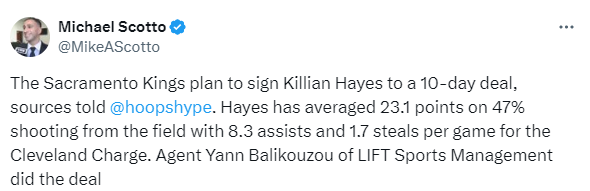 2026-02-23 05:20北京时间2月23日,据HoopsHype记者Michael Scotto报道,国王队计划与自由球员后卫基利安-海耶斯签下一份10天短合同。