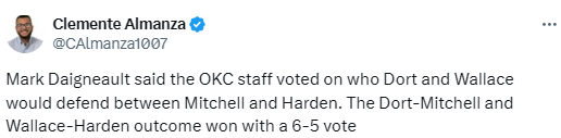 戴格诺特还透露,雷霆教练组在赛前就华莱士和多尔特在哈登与米切尔之间的防守分工进行了投票表决,“差一点点,大概是6-5票左右。所以我们的数据分析教练投出了决定性一票,那一票非常关键。”