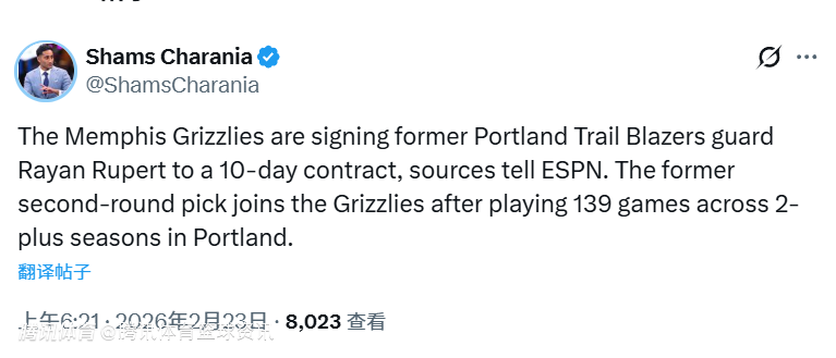 2026-02-23 06:50北京时间2月23日,据名记Shams报道,ESPN消息源透露,孟菲斯灰熊将签下前开拓者球员吕佩尔,双方签下一份10天短合同。