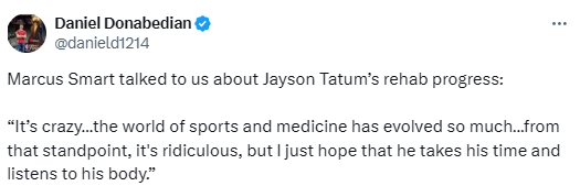 关于塔图姆的伤情恢复,斯马特表示:“这太不可思议了。如今体育与医疗领域都取得了巨大的进步,从这个层面来说,这样的情况确实有些令人费解。我只希望他能好好休养,遵从自己身体的感受。”