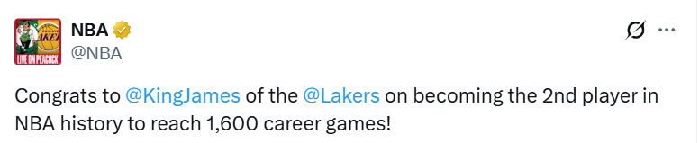 2026-02-23 08:20北京时间2月22日,NBA常规赛继续进行,湖人对阵凯尔特人。本场比赛,湖人球星詹姆斯首发出战,就此成为NBA历史上第二位职业生涯出战1600场常规赛的球员,排在他前面的仅剩名宿帕里什(1611场)。