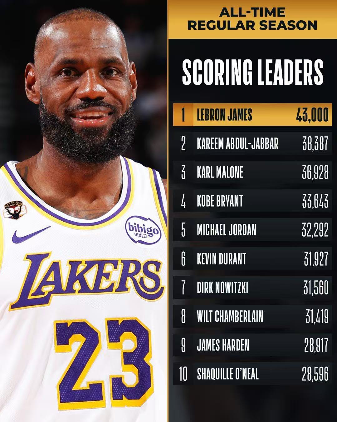 詹姆斯正式达成43000分,成为NBA历史上第一位达成如此成就的球员,继续稳固NBA历史得分王宝座,湖人官方第一时间祝贺詹姆斯;纵观NBA历史80年,仅仅只有詹姆斯一人的常规赛总得分突破40000分大关,如今更是解锁43000分再创历史新高。