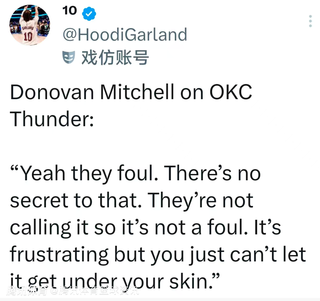 谈及雷霆队的防守表现时,米切尔表示:“没错,他们确实有犯规动作,这不是什么秘密。只是裁判没吹,那就不算犯规。这很让人沮丧,但你不能被这事影响心态。”