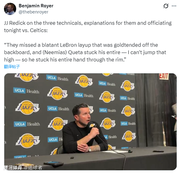 第三节科塔封盖时碰到篮网,雷迪克抱怨吃到技术犯规,赛后谈到湖人全队三人吃T,雷迪克表示:他们漏判了一个明显的詹姆斯上篮(干扰球),这个球从篮板上被碰出界;科塔整个手都穿过了篮筐,因为自己跳不了那么高。我会去了解一下这种防守方式的规则,因为说实话,这确实是一种很好的防守抛投的方法。