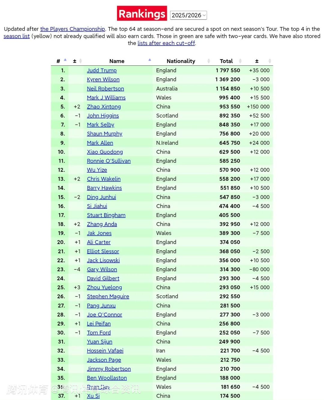 中国球员方面,肖国栋第10、吴宜泽第12、丁俊晖下滑两位到第15,斯佳辉第16,张安达第18,周跃龙第25,庞俊旭第27,雷佩凡第29,袁思俊第31。