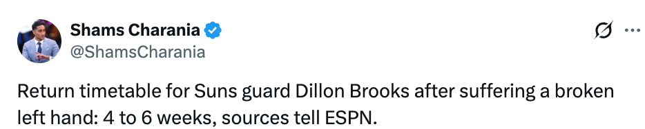 Shams:狄龙-布鲁克斯左手骨折 预计4-6周才能复出