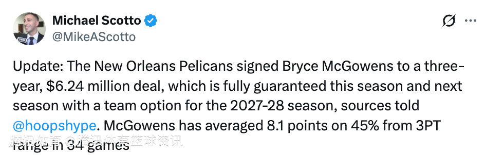 2026-02-24 01:00北京时间2月24日,据名记Scotto报道,新奥尔良鹈鹕已经与麦戈文斯签下一份3年价值624万美元的合同。合同本赛季和下赛季为全额保障,2027-28赛季为球队选项。