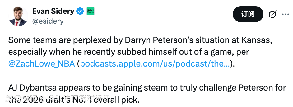 2026-02-24 01:10北京时间2月24日,据美记Zach Lowe报道,一些球队对达林-彼得森在堪萨斯大学的处境感到困惑,尤其是在他最近自行要求下场之后。AJ-迪班萨的势头正盛,看起来将真正挑战彼得森在2026年NBA选秀中成为状元的位置。