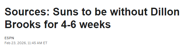 2026-02-24 06:10北京时间2月24日,据名记Shams报道,太阳队后卫狄龙-布鲁克斯因左手骨折,将缺阵4至6周。狄龙是在太阳战胜奥魔术队的比赛中受伤的。