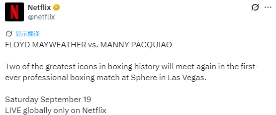 Netflix 官方确认:“拳击史上两位最伟大的传奇将再度对决,这也是拉斯维加斯球形场馆举办的首场职业拳击赛。9月19日周六,Netflix全球直播。”