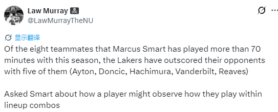 本赛季,斯马特特共有8名队友与其同场时间超过70分钟。其中,在他与艾顿、东契奇、八村塁、范德比尔特、里夫斯这5人一同登场的时段里,湖人队均净胜对手。