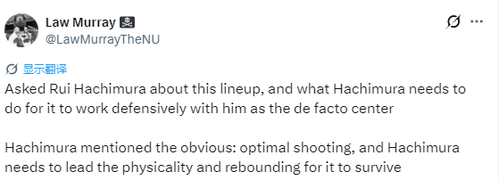 八村垒:我觉得更多是打快速进攻,这套阵容能让我们获得更多的三分出手机会。我们会得到很多空位,这就是这套阵容的进攻价值。整个赛季你们都能看到这类阵容,对阵独行侠那场大家也看到了,这就是我们想要的比赛节奏。这也是我们一直期待使用的阵容之一,全员都能投三分,主打高速进攻,拉开场上空间。