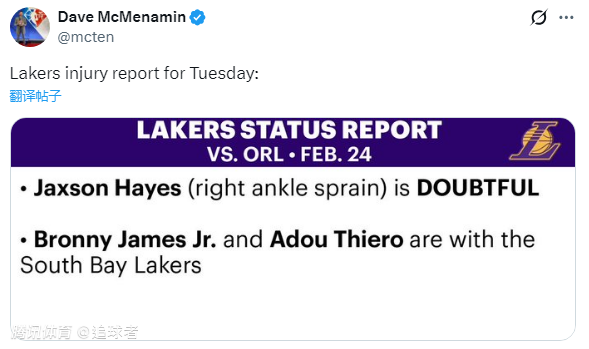 湖人官方已经公布明日对阵魔术的伤病报告,海斯(右脚踝扭伤)小概率出战,布朗尼和阿杜-蒂耶罗被下放到南湾湖人队;换言之,詹姆斯、东契奇和里夫斯都可以出战。