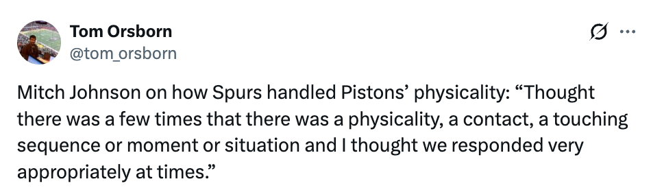 另外,约翰逊也表示,各支球队对阵马刺时会打得更具对抗性,这早已不是秘密,但马刺也会用自己的对抗强度予以回应:“我认为比赛中确实出现了几次对抗、接触和肢体动作的场面,而我们在很多时候都做出了非常恰当的回应。”
