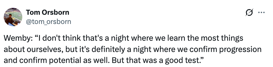 文班表示这场胜利,印证了球队的潜力和所取得的进步:“我不认为今晚是我们最能看清自身不足的一场比赛,但这绝对是一场印证了球队进步、也印证了我们潜力的比赛。不过,这确实是一次不错的考验。”