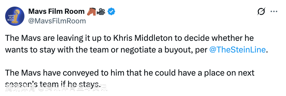 2026-02-24 13:20北京时间2月24日,据名记Stein报道,独行侠将决定权交给米德尔顿,由他自己决定是留队,还是与球队协商买断。球队已向他明确表示,如果他选择留队,下赛季球队仍会为他预留位置。