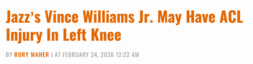 前交叉韧带伤病?小文斯-威廉姆斯左膝严重扭伤 爵士主帅怒批这不是篮球