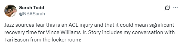 对于文斯-威廉姆斯受伤,爵士主教练哈迪表示:他的情况看起来不太好,那不是篮球动作。