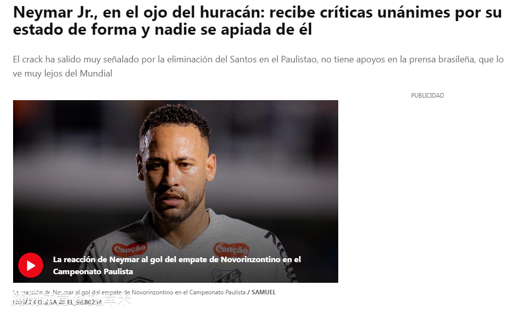 桑托斯提前无缘圣保罗州锦标赛4强后,内马尔成了众矢之的。巴西球迷对他毫无宽容可言,铺天盖地的批评大多言辞激烈,这位足坛巨星未得到丝毫同情。
