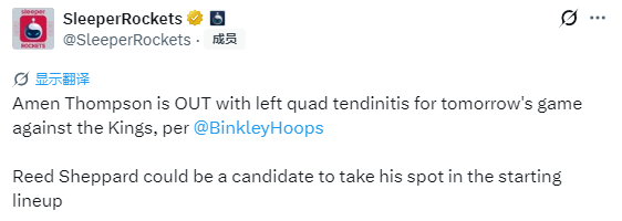 2026-02-25 05:50北京时间2月24日,据记者Lachard Binkley报道,火箭球星阿门-汤普森因左四头肌肌腱炎将缺席明天对阵国王队的比赛。队友谢泼德可能是顶替他进入首发阵容的人选。
