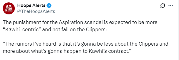 Tim Kawakami表示:关于快船队事件的诸多传闻即将尘埃落定,我听说处罚将主要针对莱昂纳德,据我听到的消息,重点不在于快船队,而在于莱昂纳德的合同将面临何种处罚。