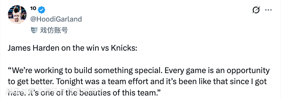哈登表示:“到目前为止,我们这支球队展现出了很强的斗志。说实话,我们一直在想办法变得更好,去弄清楚什么有效、什么没用。我也一样,我们都在努力去做一些特别的事情。每场比赛对我们来说都是一次进步的机会。”