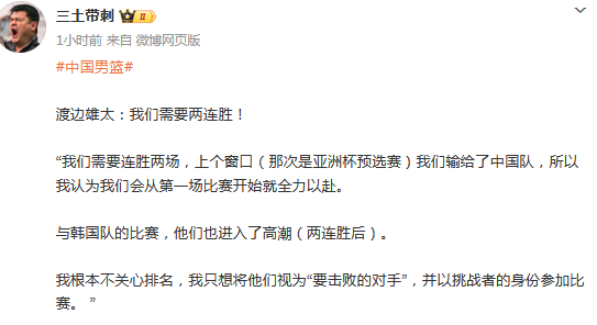 2026-02-25 16:30世预赛第二个窗口期,中国男篮对阵日本男篮将于2月26日正式开打,赛前,日本男篮核心渡边雄太接受媒体采访,谈到即将主场对阵中国男篮的话题。