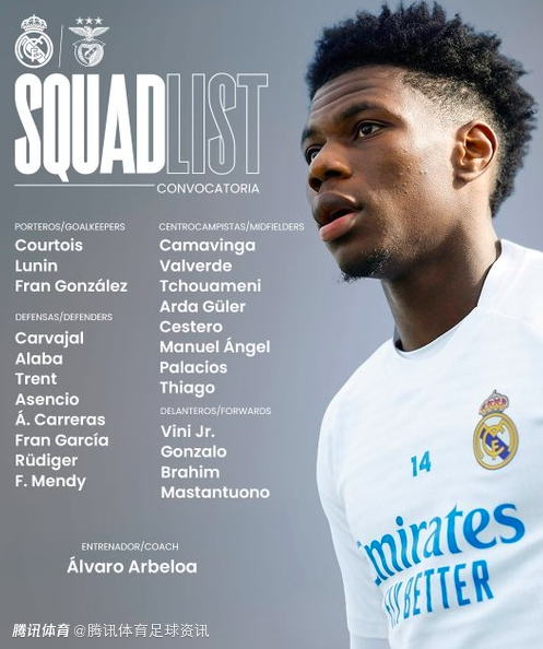 皇马对阵本菲卡大名单:姆巴佩、赫伊森缺阵 维尼修斯、巴尔韦德在列