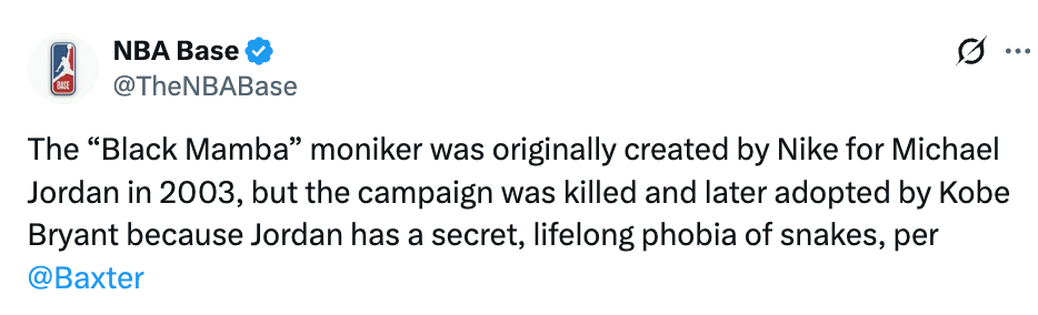 多年来,乔丹在球员间一直有个绰号“黑猫”,但耐克团队认为,乔丹在场上的侵略性,更像蛇的速度与敏捷。但与乔丹合作撰写1993年《稀有空气》一书的作者马克-万西尔,在2024年的播客中,透露了乔丹对蛇的恐惧有多深。