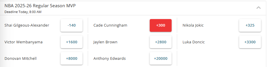 根据最新的赔率排名,目前还在榜上的有8名球员,具体排名如下:亚历山大(-140)、坎宁安(+300)、约基奇(+325)、文班亚马(+1600)、杰伦-布朗(+2800)、东契奇(+3300)、米切尔(+8000)、爱德华兹(+20000)