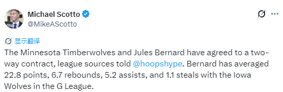 2026-02-26 06:40北京时间2月26日,据记者Michael Scotto报道,联盟消息人士向HoopsHype透露,明尼苏达森林狼队与朱尔斯-伯纳德签下一份双向合同。