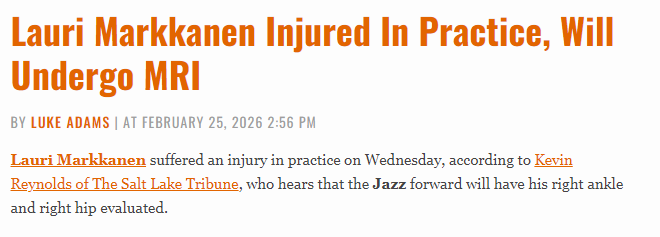 2026-02-26 07:10北京时间2月26日,据记者凯文-雷诺兹报道,马尔卡宁在训练中受伤,这位爵士前锋将接受右脚踝与右髋部的检查。