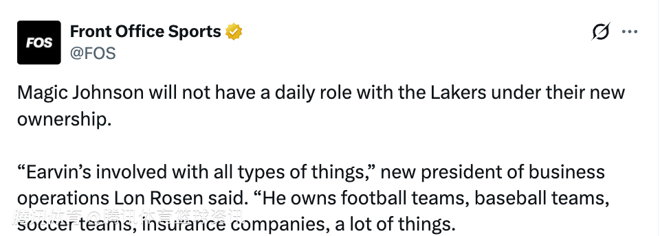 湖人新任商务运营总裁:魔术师不再担任球队日常管理职务 他参与的业务非常广泛