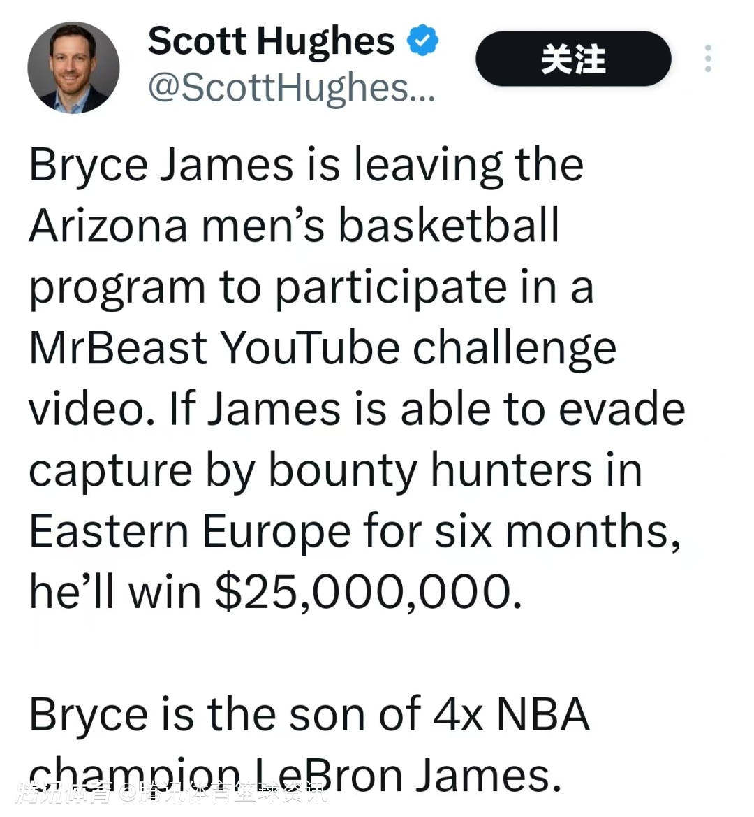 2026-02-26 09:50北京时间2月26日,据记者Scott Hughes报道,詹姆斯小儿子布莱斯-詹姆斯将退出亚利桑那大学男篮,去参加Mr Beast(野兽先生)的YouTube挑战视频。如果他能在东欧躲避赏金猎人的追捕长达6个月,就将赢2500万美元奖金。