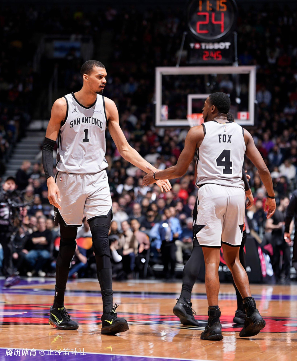 马刺队今天打的并不轻松,在首节仅领先1分的情况下,他们连续两节比赛处于被动,其中第三节更是单节输掉了10分,全场比赛最多落后达到15分之多。随后在末节比赛中,马刺队祭出死亡防守,打出一波28-12完成反超并建立优势。随后猛龙队没有放弃连续得分,马刺队关键时刻哈珀、福克斯、文班亚马连续六罚中二,好在猛龙队三分不进,文班亚马摘下篮板后拿到胜利。