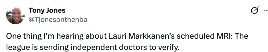 随后,另外一名爵士队记Tony Jones跟进报道,NBA官方将派遣独立医生去核验马尔卡宁的MRI结果。值得一提的是,爵士目前已经有多名球员赛季报销,包括凯斯勒(赛季初只打了5场比赛就报销)、努尔基奇、小贾伦-杰克逊。