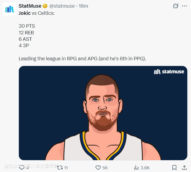 这场比赛约基奇33分钟,28中11,三分13中4,罚球7中4,拿到30分12篮板6助攻,命中率39.3%,三分命中率30.8%,真实命中率48.3%,正负值+13,他在末节只打了3分钟就早早打卡下班了。