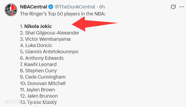 在这场比赛之前,美媒The Ringer选出了本赛季前50球星,约基奇第一、亚历山大第二、文班亚马第三、东契奇第四、扬尼斯第五、华子第六、伦纳德第七、库里第八、坎宁安第九、米切尔第十。