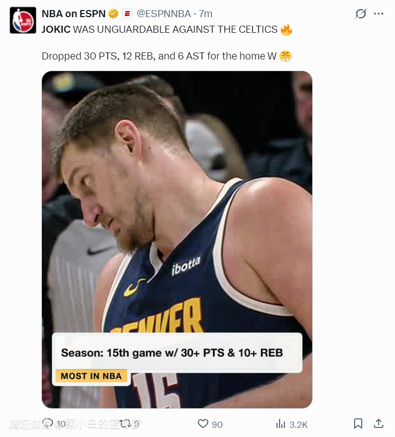 约基奇本赛季已经完成第15次30+10,就连NBA官方都盛赞约基奇在对阵绿凯的比赛中不可阻挡。