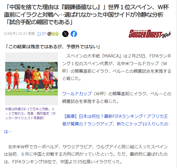 针对西班牙媒体的这一报道,日本媒体《足球文摘网》发布题为《放弃中国队的理由是“没有锻炼价值”—— 世界排名第一的西班牙队,世界杯前将与伊拉克队交手…… 未能入选的中国队方面冷静分析:“这也是国足约赛困境的缩影”》的文章,并还原了事件经过。