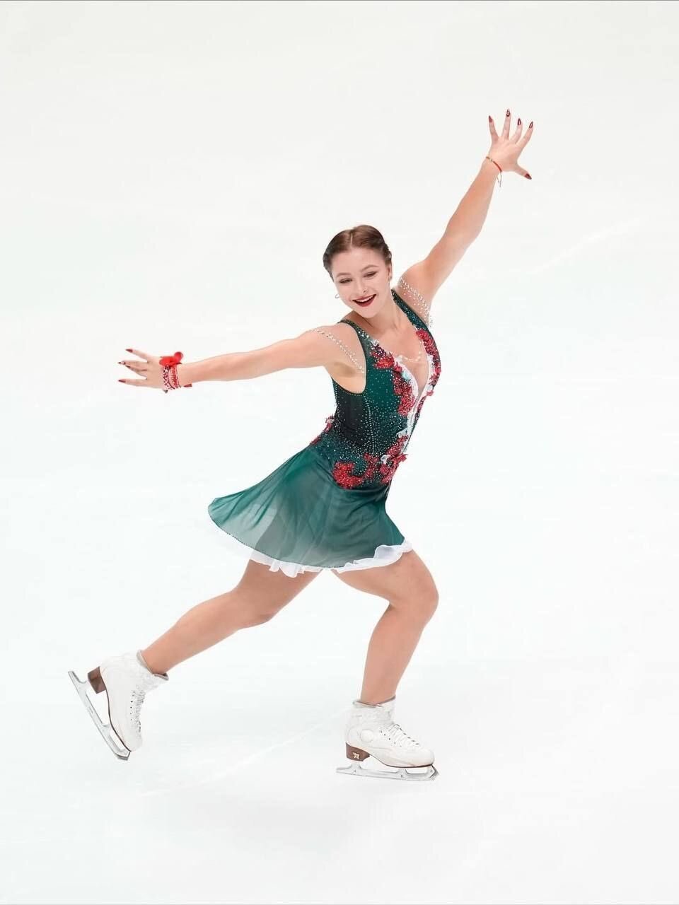 比如拿到女单第十名的哈萨克斯坦选手萨摩德尔金娜自由滑《查尔达斯舞曲》是绿色+红花。