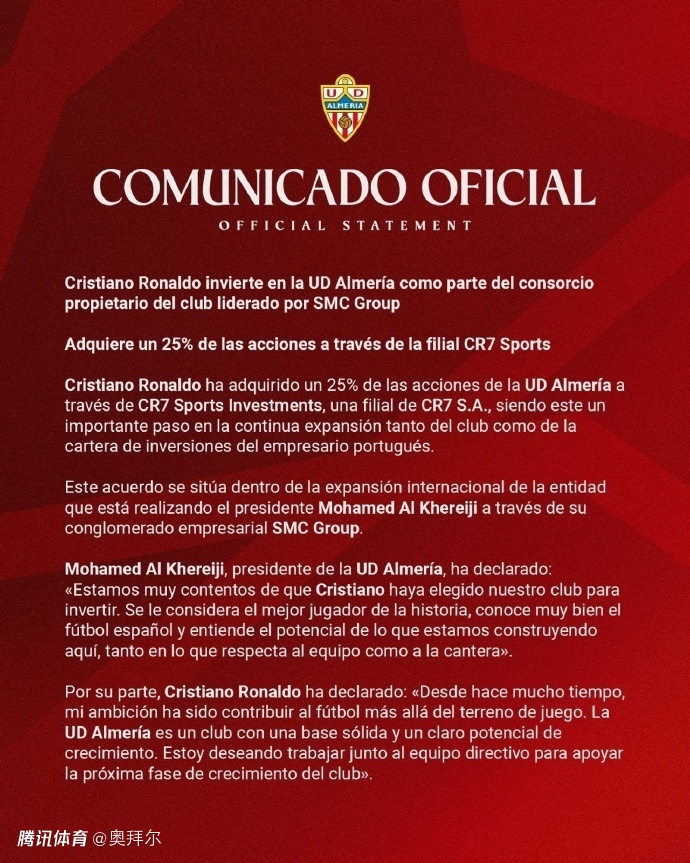 在声明中,C罗表示,“一直以来,我希望在球场之外为足球做出贡献。阿尔梅里亚是一家拥有坚实基础和显著成长潜力的西班牙俱乐部。我希望能与管理团队合作,支持俱乐部进入新的成长阶段。”