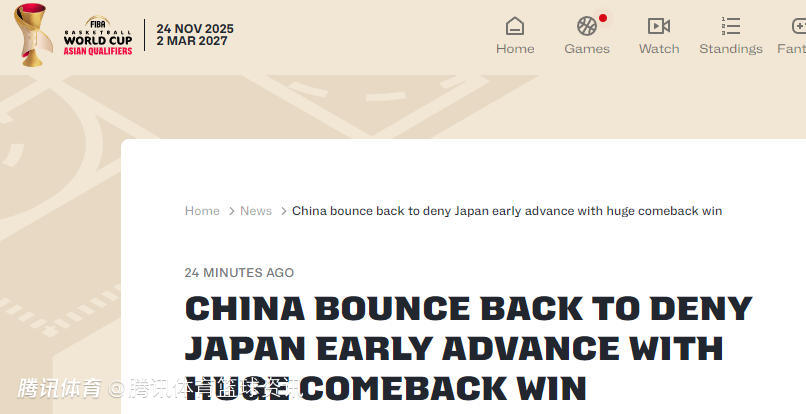 FIBA官网点评中日之战:贺希宁赵继伟吹响反击号角 胡金秋统治禁区