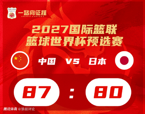 中国篮协官方社媒赛后更新社媒发文:在刚刚结束的2027国际篮联世界杯预选赛第二窗口期比赛中,中国男篮87-80战胜日本男篮。